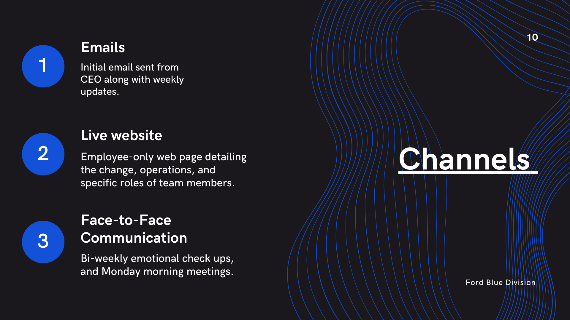 The Campaign: Ford is accelerating its shift to electric vehicles by splitting into two dedicated divisions: one for electric vehicles and one for traditional gas-powered cars. This strategic move aims to enhance technological innovation and growth in the EV sector while continuing to drive profits in the traditional market. As strategic communicators, our role was to effectively convey this change, ensure ongoing sales, uphold Ford Blue's legacy, and support employees throughout the transition.