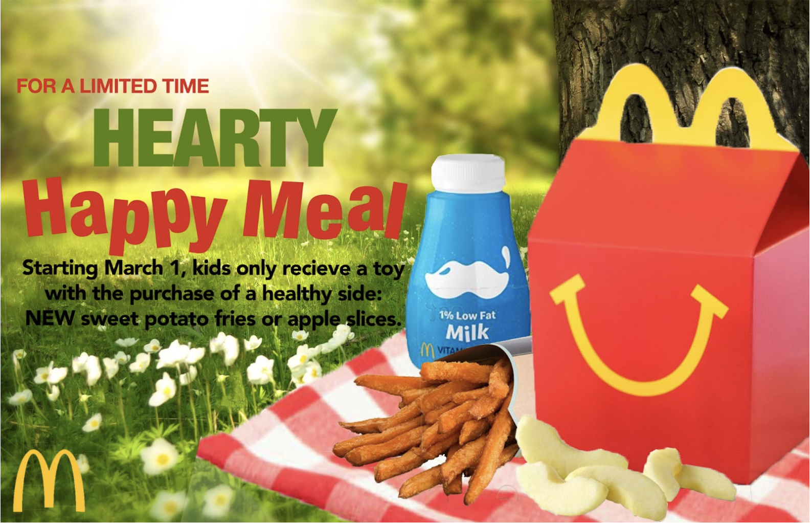 In light of National Nutrition Month, McDonald’s will introduce the Hearty Happy Meal campaign March 1, 2024, along with the addition of new sweet potato fries. The Hearty Happy Meal campaign will be an 8-month trial run campaign, ending Nov. 1, with the goal to entice kids to choose healthier sides as an incentive to get a Happy Meal toy.